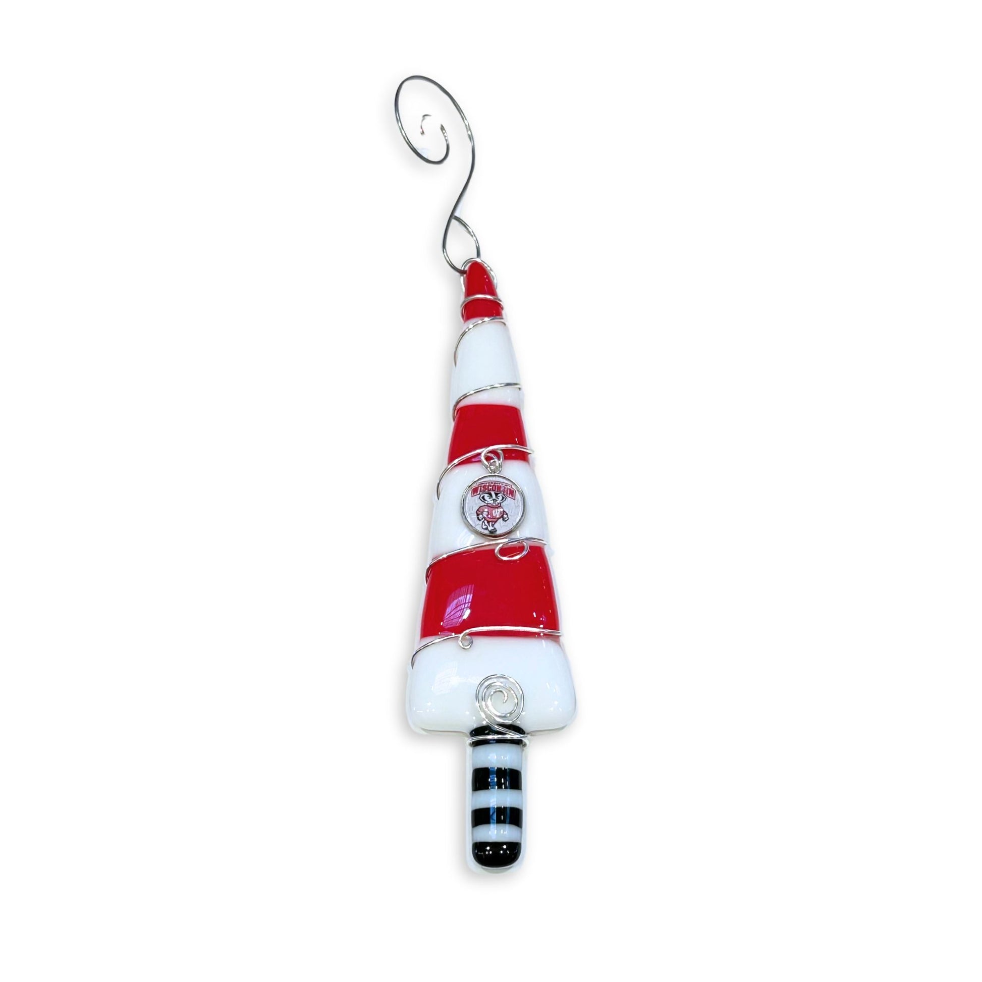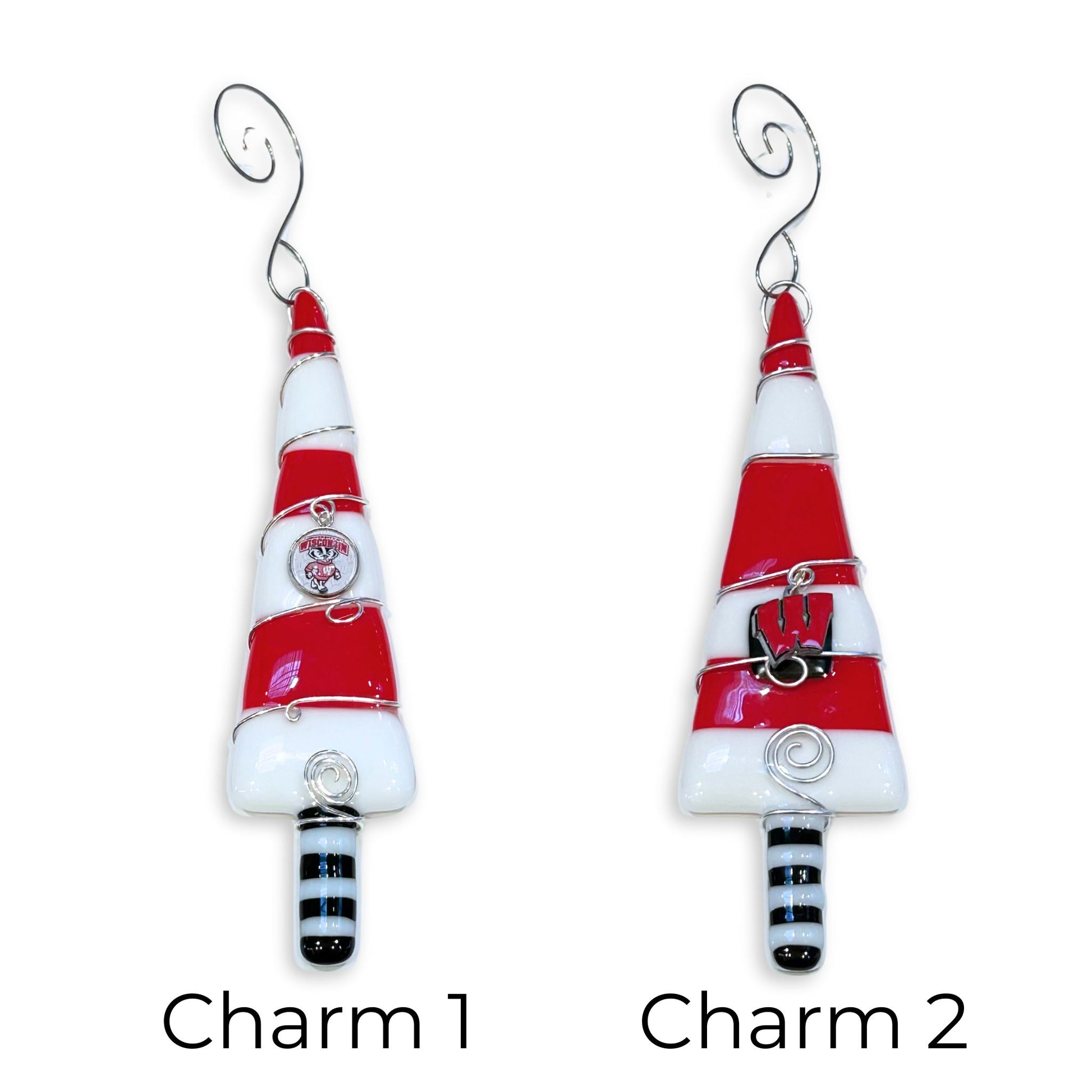 Adorn your holiday tree with a one-of-a-kind fused glass Packer-inspired ornament. These red and white decorative ornaments are in the shape of a Christmas tree and are created using a opaque glass in red, white and black glass. Silver wire is used to add a whimsical touch and to hold a red "W" or Bucky the Badger charm for added flair! Made by glass artist Mary Jo Weidert from Oshkosh, WI.